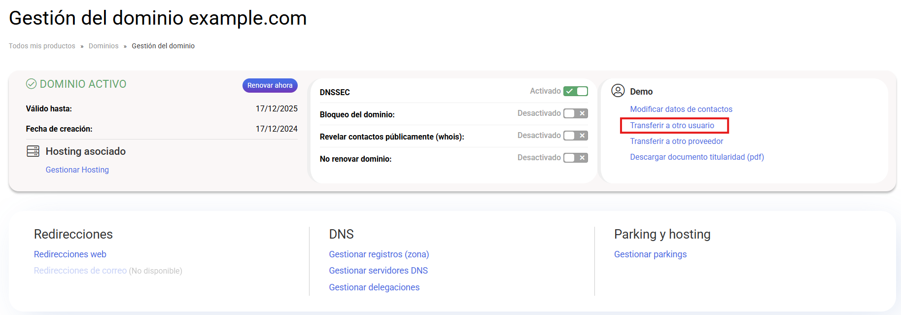 En la pantalla de gestión del dominio, debes pulsar en la opción Transferir a otro usuario.