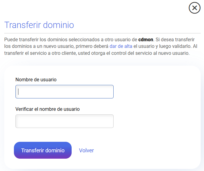 En esta pantalla debes completar los campos Nombre de usuario y Verificar el nombre de usuario, introduciendo el nombre de usuario (NO correo electrónico de usuario) al que quieres transferir el dominio. Una vez Introducido el nombre de usuario en ambos campos, pulsa en Transferir dominio, y automáticamente el dominio pasará al usuario indicado.
