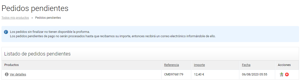 Al pulsar sobre Ver detalles de la sección "Productos", se despliega más información del pedido pendiente.