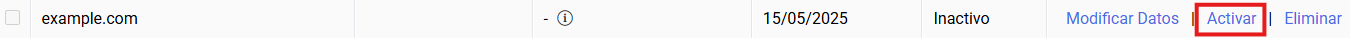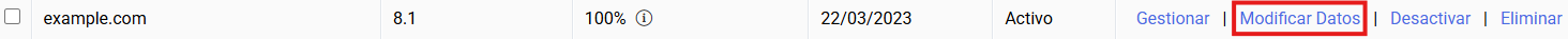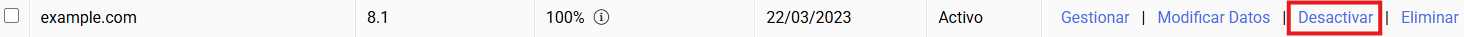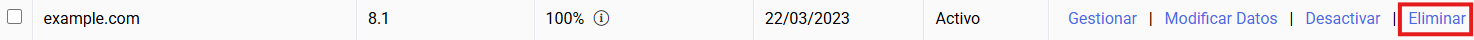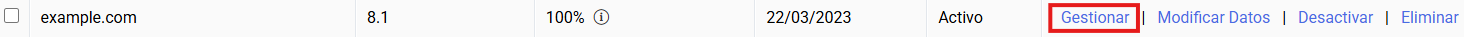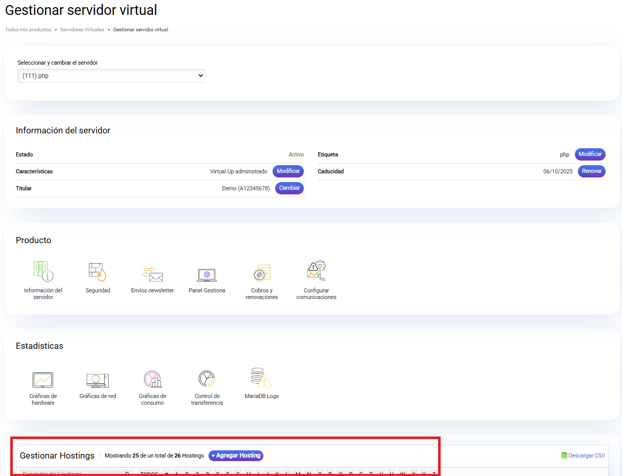 En la pantalla de "Gestionar servidor Virtual" podrás gestionar los alojamientos que tengas creados desde la sección Gestionar alojamiento.