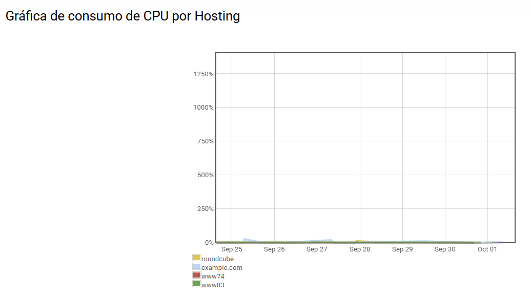 La gráfica muestra una lista con los diez alojamientos que más CPU consumen. El eje horizontal muestra el uso de CPU de cada hosting por franja horaria, mientras que el eje vertical muestra el uso de CPU en %. En este ejemplo, el servidor cuenta con 4 cores de CPU, lo que equivale a 400 en el eje vertical.