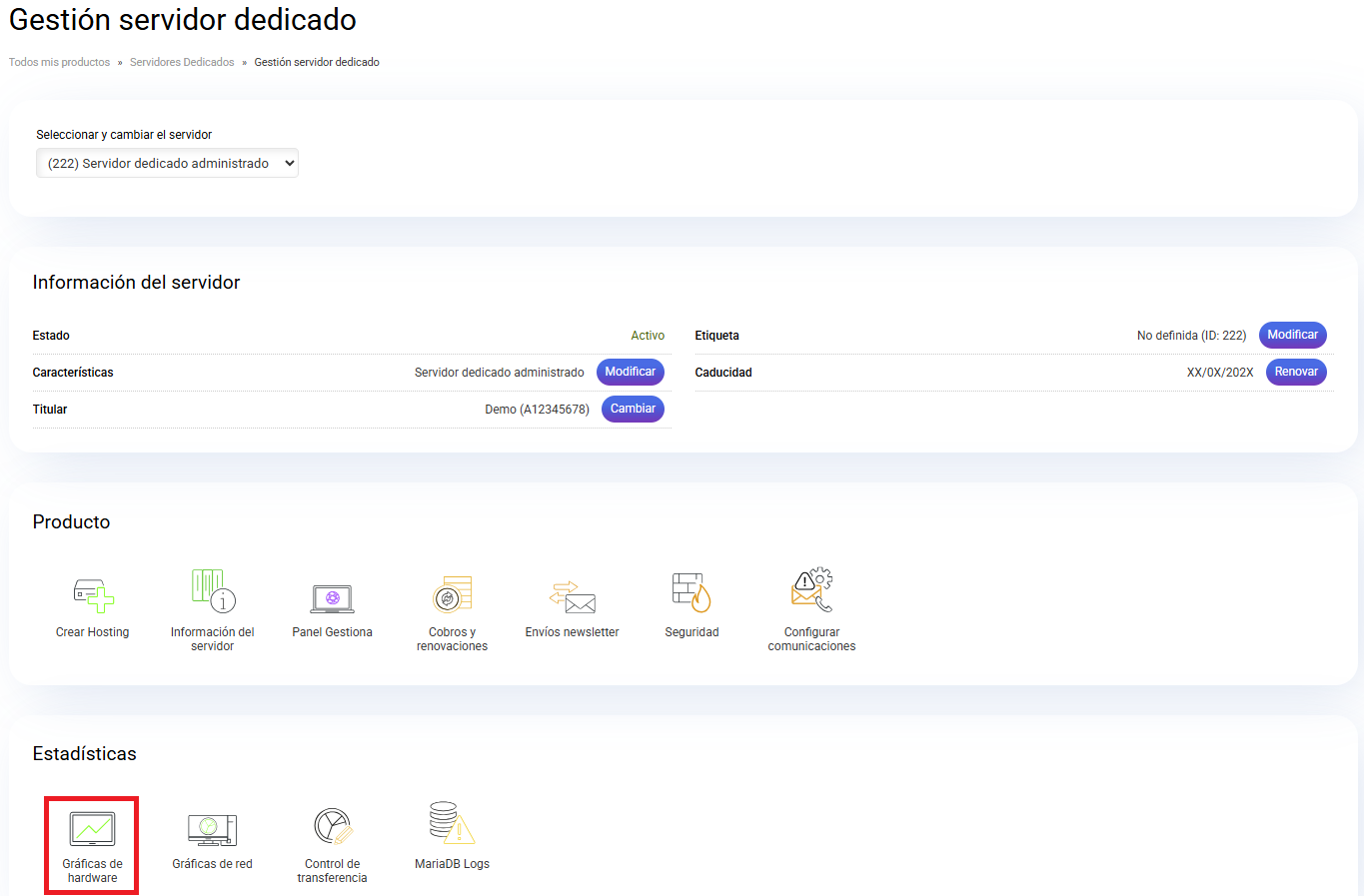 Las gráficas de hardware te permiten visualizar el estado de tu servidor. Para consultarlas, entra en la gestión del servidor desde tu panel de control de cdmon y pulsa en la opción Gráficas de consumo.