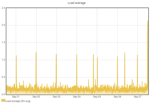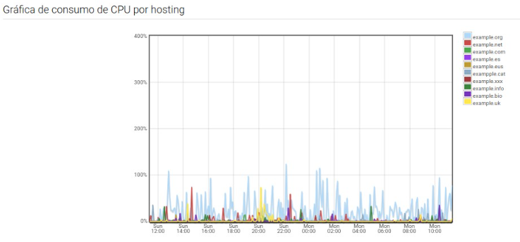 La gráfica muestra una lista con los diez alojamientos que más CPU consumen. El eje horizontal muestra el uso de CPU de cada hosting por franja horaria, mientras que el eje vertical muestra el uso de CPU en %. En este ejemplo, el servidor cuenta con 4 cores de CPU, lo que equivale a 400 en el eje vertical.