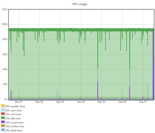 steal time: % de tiempo que una CPU virtual espera su tiempo de procesamiento en la CPU física. En los servidores dedicados administrados este tiempo no procede al ser todos sus CPUs físicas.