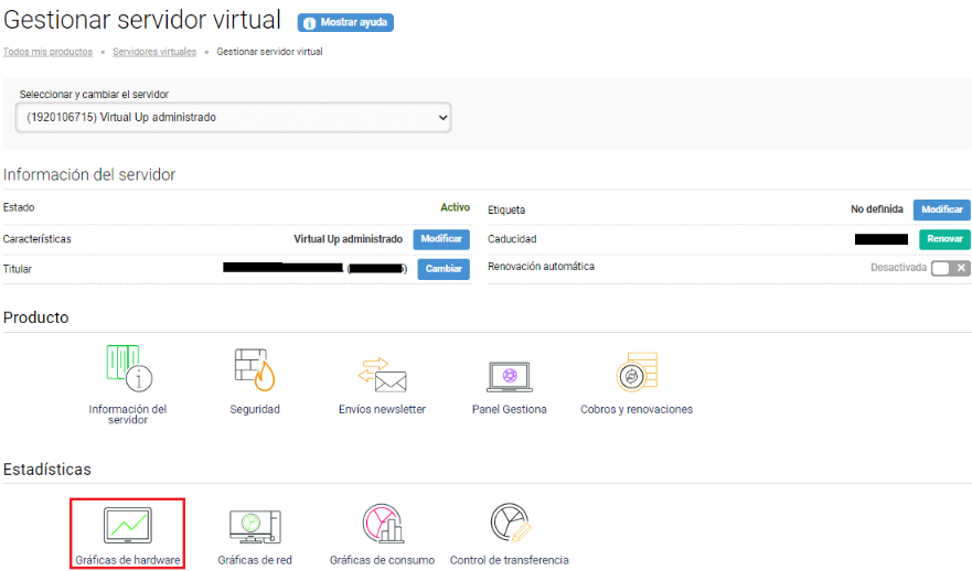 Las gráficas de hardware te permiten visualizar el estado de tu servidor Virtual Up. Para consultarlas, entra en la gestión del servidor Virtual desde tu panel de control de cdmon y pulsa en la opción Gráficas de hardware.