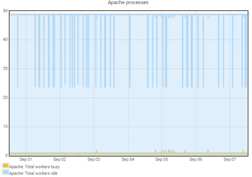 Apache processes: número de procesos apache corriendo en el servidor. Se dividen entre los procesos que ya están corriendo y los que están preparados para empezar a correr, pero se encuentran esperando una petición de conexión.