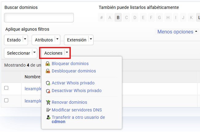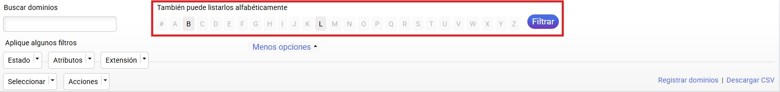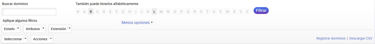 Una vez desplegado el botón "Más opciones ", podrás listar de forma rápida y eficaz los dominios que se encuentren según su estado, atributos o extensión.
