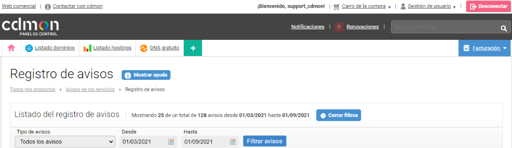 Si dispone de un servidor virtual o dedicado en su usuario de cdmon, en la gestión de su usuario de cdmon podrá activar los avisos personalizados por exceso de consumo de su servidor/servidores. En esta guía, te mostraremos cómo activar los avisos ...