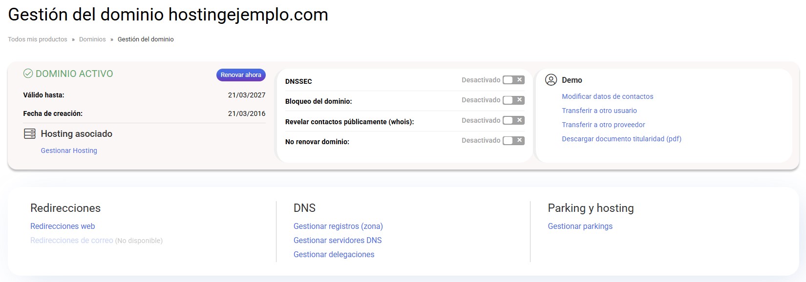 Una vez pulsada la opción Dominio, accederás a la pantalla de "Gestión del dominio", donde encontrarás toda la información del dominio y acciones que puedes realizar.