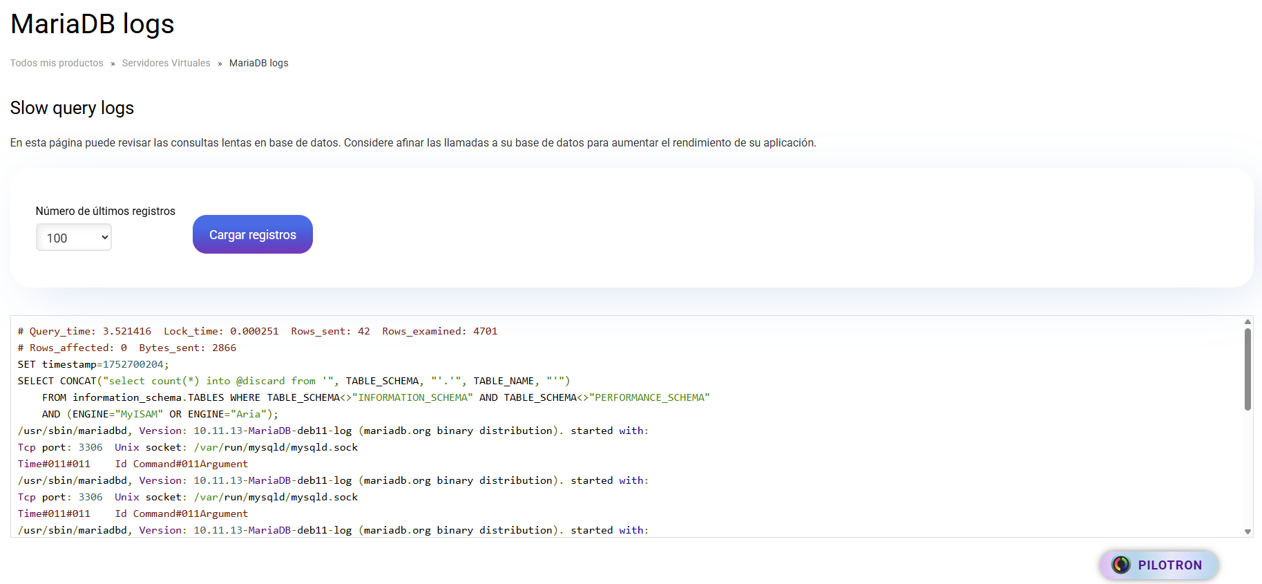 Esa sección ya es la nueva pantalla de logs de MariaDB. En esta página podrá revisar las consultas lentas de su base de datos y afinar dicha base de datos para aumentar su rendimiento. Ejemplo: