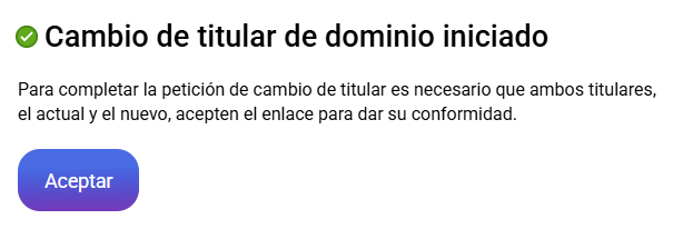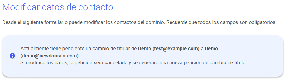 Este mensaje quiere decir que se ha enviado un correo al contacto actual y al nuevo para aceptar el cambio. En la página de "Modificar datos de contacto", verás el siguiente mensaje conforme hay un proceso de cambio de titular.