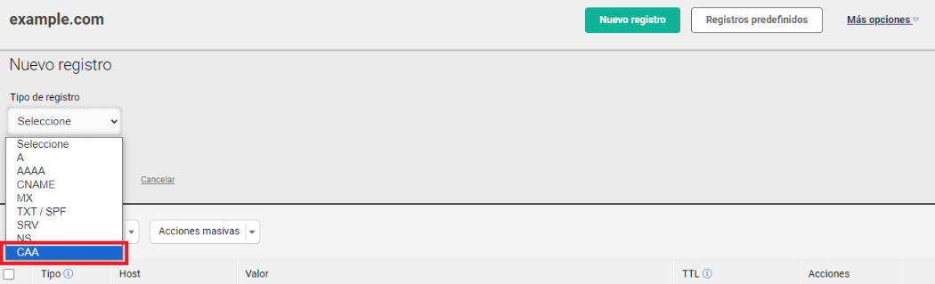 Un registro CAA (Certification Authority Authorization) te permite determinar qué autoridades certificadoras (CA) pueden emitir certificados (SSL) para tu dominio o subdominios.