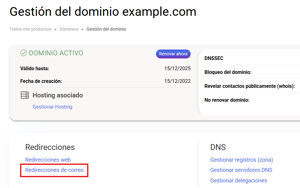 Si ahora volvemos a la Gestión del dominio en cuestión, podrá observar que las redirecciones de correo ya se muestran disponibles:
