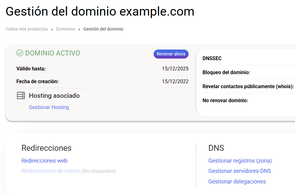Para ello, debe acceder a los registros zona de su dominio, puede hacer clic en “Gestionar registros (zona)” que aparece justo a la derecha del correo no disponible, en la columna de “DNS”