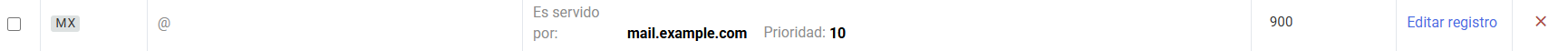 Si encuentras que el registro MX está configurado a mail.nombredeldominio.com u otro valor, será necesario editar este registro con la siguiente información: