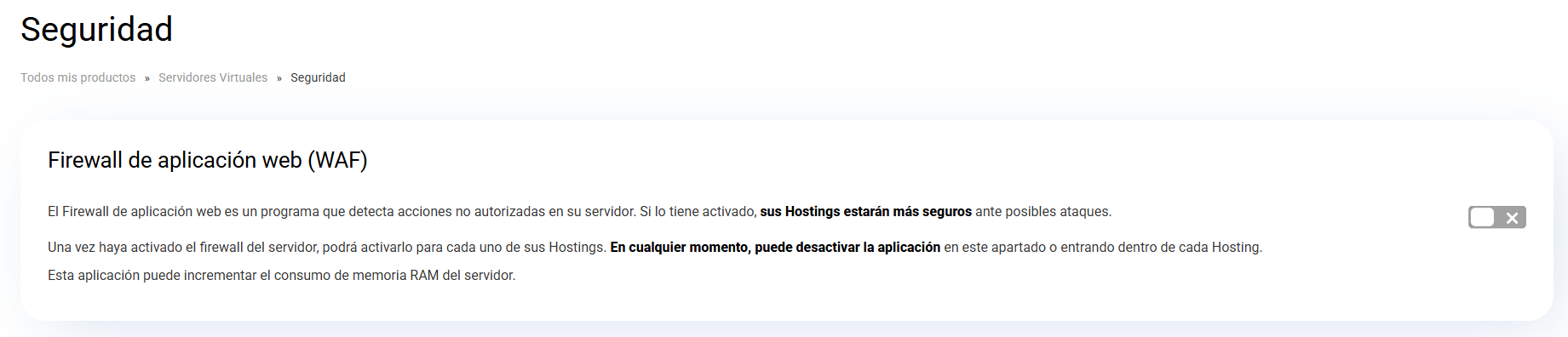 Una vez dentro, en la parte superior visualizará el botón como "Desactivado" y podrá activar el WAF en el servidor dedicado.