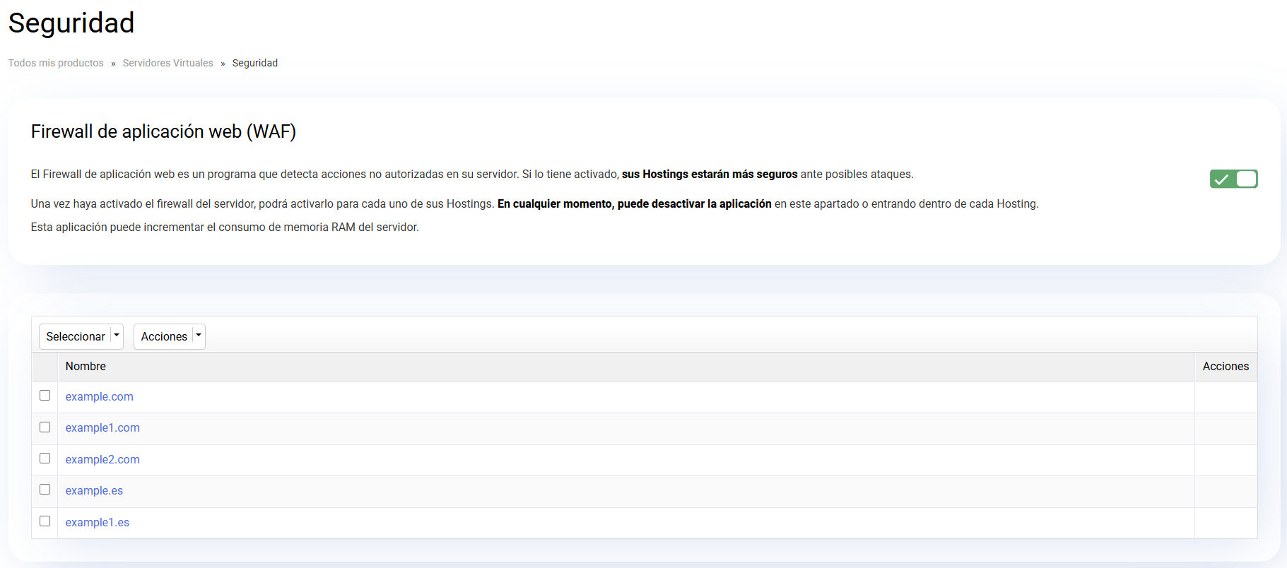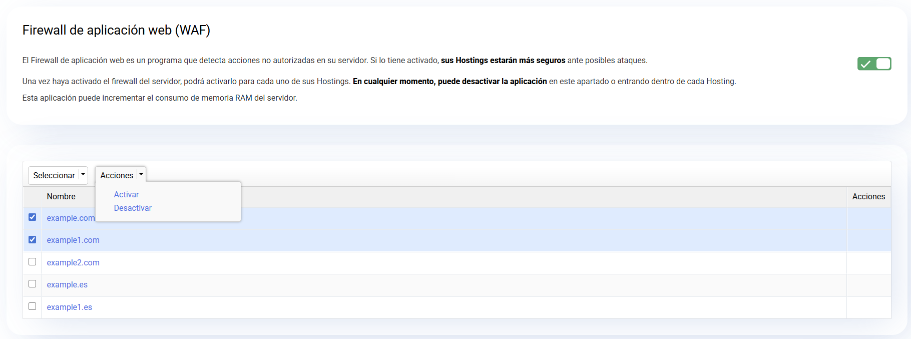 IMPORTANTE: esta opción instalará el Firewall de Aplicación Web (WAF) en su servidor. Esto le permitirá activar y desactivar individualmente y masivamente el estado del servicio en sus alojamientos.
