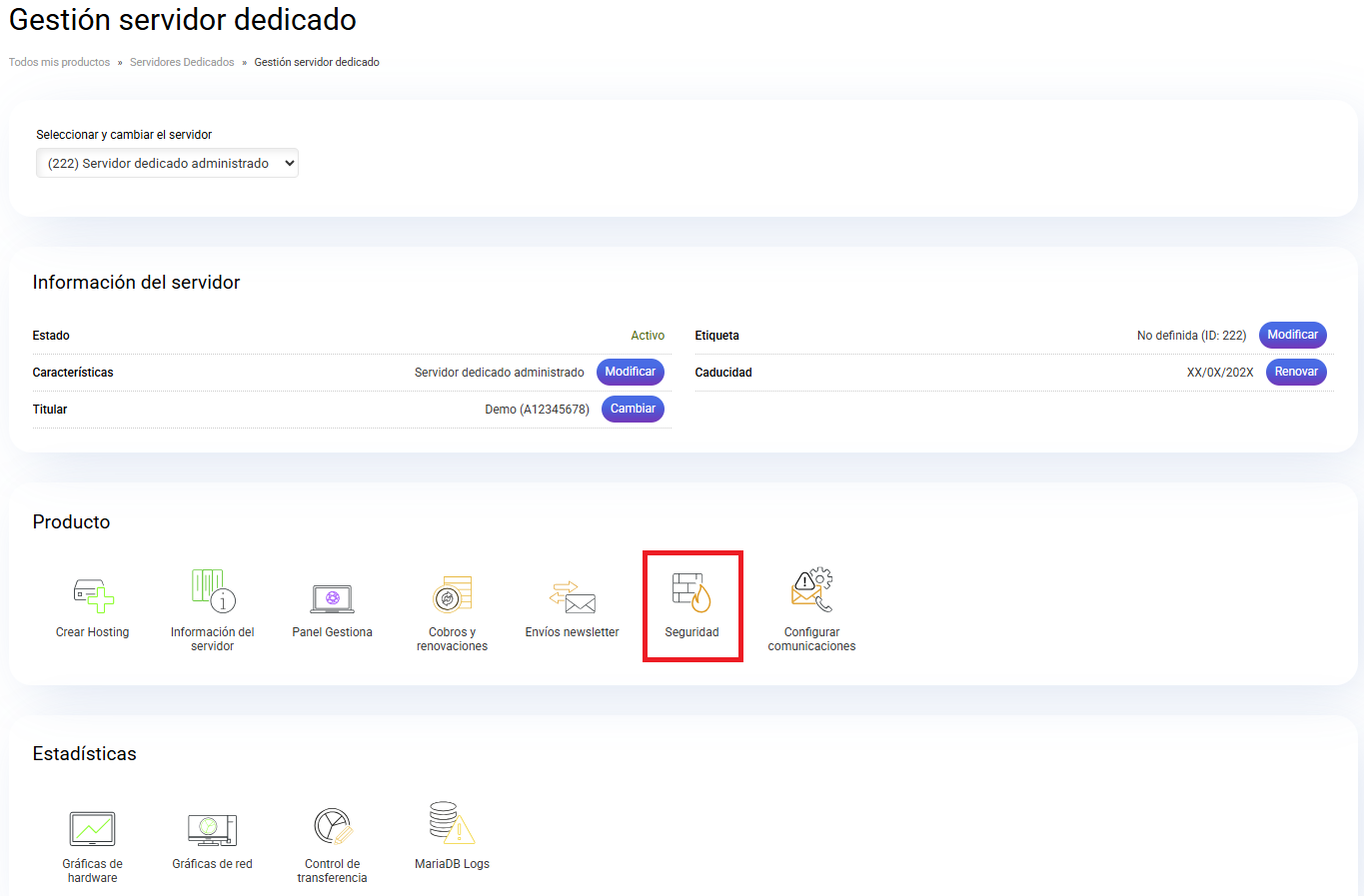 Dentro de su servidor dedicado en el apartado de Seguridad, podrá activar o desactivar el Firewall de Aplicación Web (WAF) para sus alojamientos: