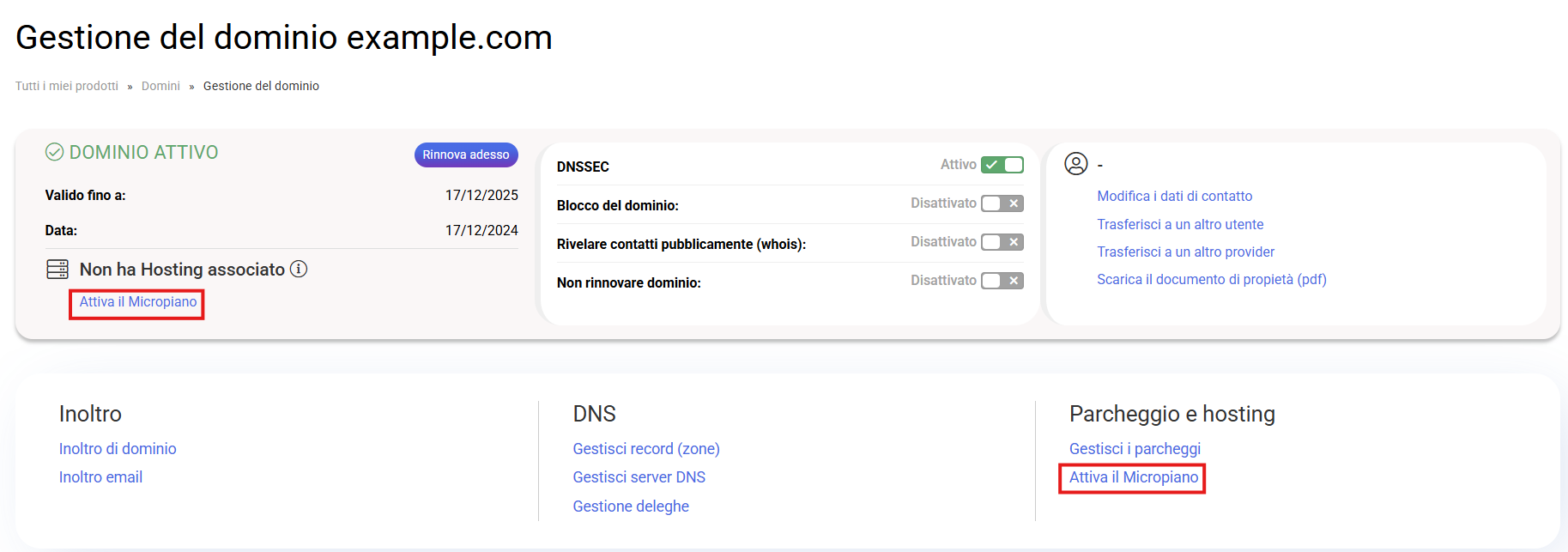 - Nella schermata di gestione del dominio fare clic su una delle due opzioni chiamate Attivare Microplan per attivare l'alloggio gratuito.