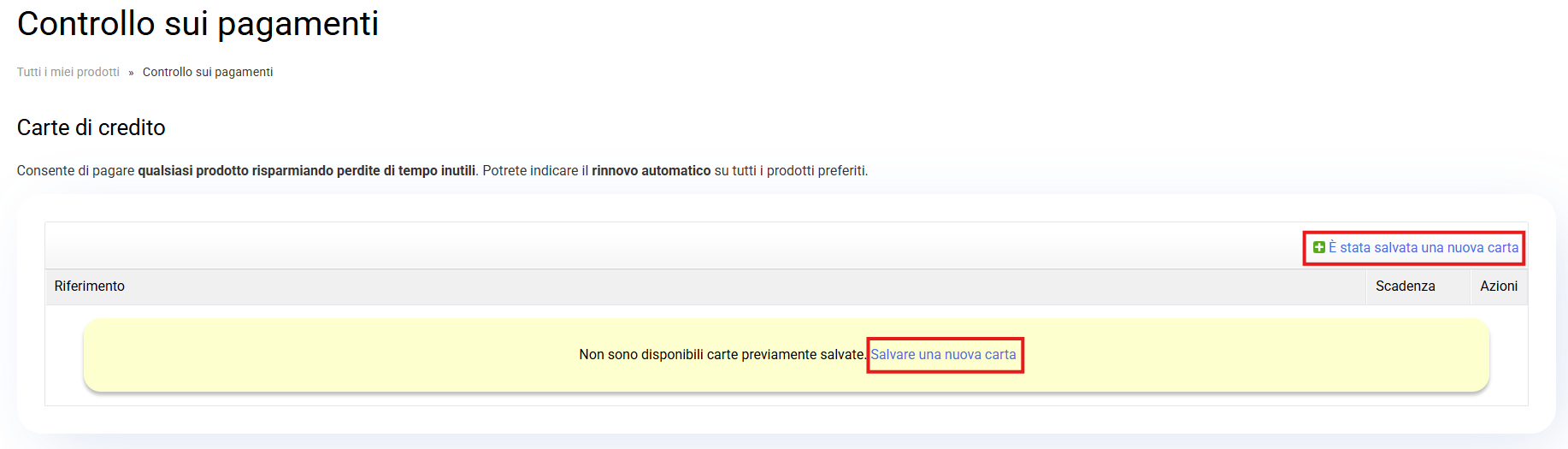 Se si fa clic sull'opzione salvare una carta accederai alla schermata "Controllo pagamento" dove puoi aggiungere una scheda facendo clic sull'opzione Nuova carta salvata.