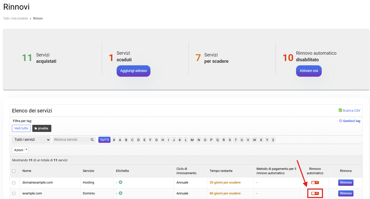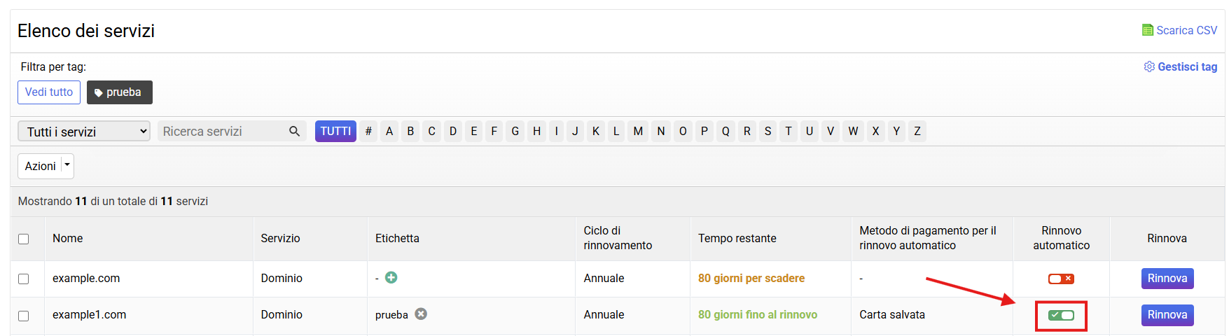 Se avete soldi nel Equilibriooppure hai il sistema di pagamento-by-card attivo, puoi abilitare il rinnovo automatico. Con questo metodo di rinnovo, i domini verranno automaticamente rinnovati quattordici giorni prima della data di scadenza.