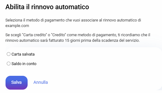 Abilitazione di questa opzione apparirà una schermata in cui è possibile scegliere il metodo di pagamento per il rinnovo automatico del dominio.