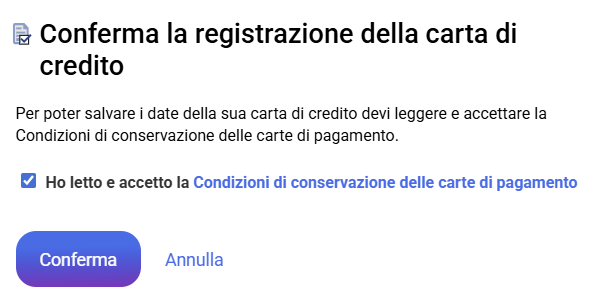 Per proseguire con il processo è necessario confermare lo scarico della scheda leggendo e accettando le condizioni di memorizzazione dei dati.