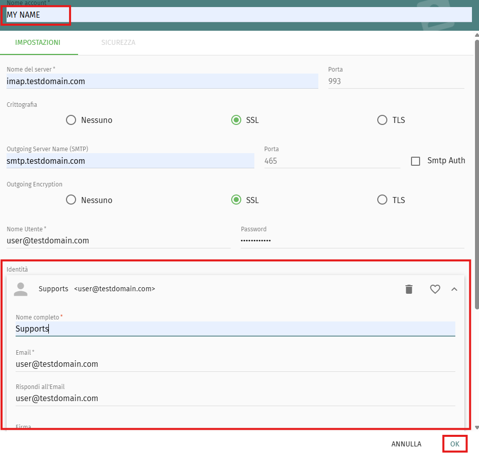 Nota: I dati specifici del server (nomi hostIMAP/SMTP) devono essere sempre ottenuti dal provider di posta o dalla dashboard di hosting. In caso di dubbio, controlla con il tuo fornitore di posta elettronica.