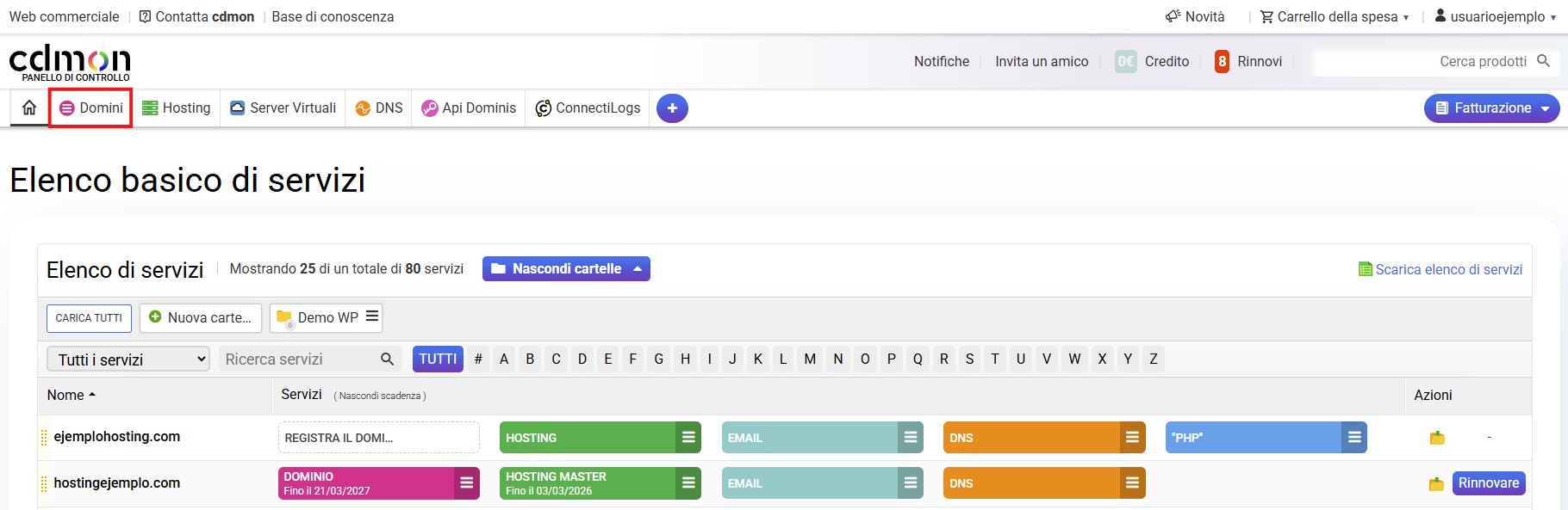 1.- Accedere al pannello di controllo di cdmon e "elenco di base dei servizi" clicca sull'opzione Dominio.