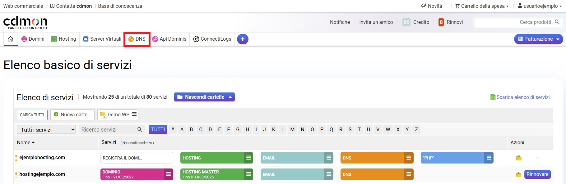 1.-Accedi alla tua dashboard di cdmon e nella "elenco di base dei servizi" fare clic sull'opzione menu in alto Elenco del dominio.