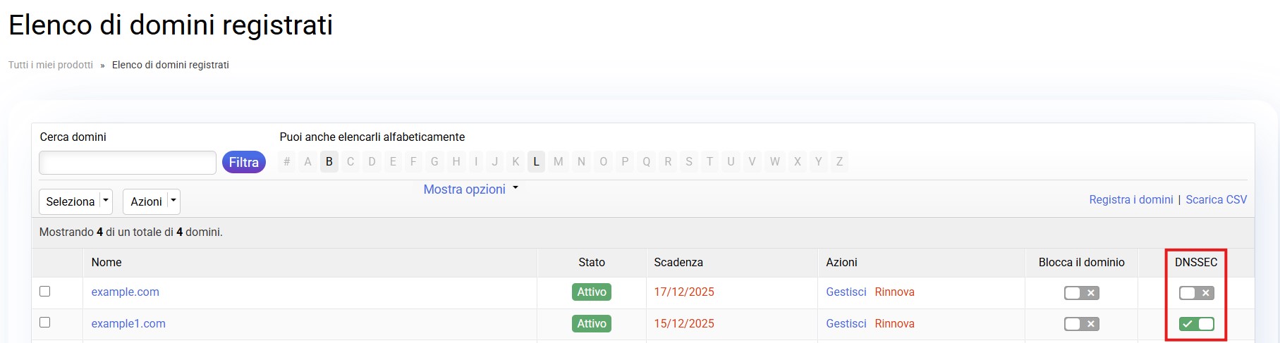 2.- Nella pagina "elenco dominio registrato" è possibile abilitare e disabilitare DNSSEC su ciascuno dei domini compatibili con DNSSEC.