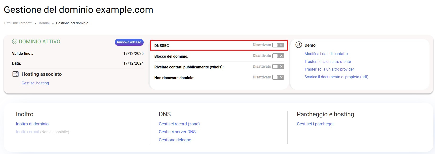 2.- Nella schermata di gestione del dominio vedrai l'opzione per attivare e disattivare il "DNSSEC".