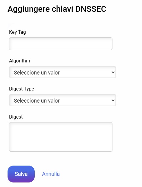 Clicca su Gestire le chiavi DNSSEC Per accedere alla schermata di gestione delle chiavi DNSSEC, dove è possibile gestire le chiavi del provider. Fare clic sull'opzione Aggiungere il tasto DNSSEC per accedere al modulo sottostante e aggiungere la chiave * fornita dal provider DNS.