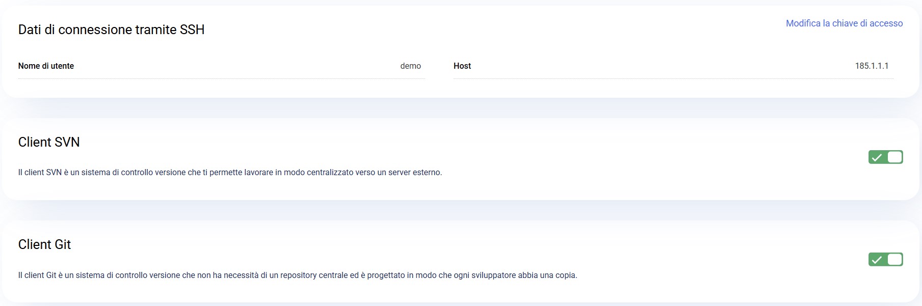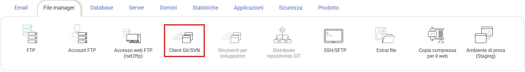 Nelle versioni superiori a PHP 7.3 invece del pulsante Clienti Git/SVN un altro pulsante chiamato "Hosting per sviluppatori", attraverso il quale verrà attivato Git/SVN, oltre a SSH e SFTP. Per fare questo, sarà necessario seguire le istruzioni riportate nel seguente link: