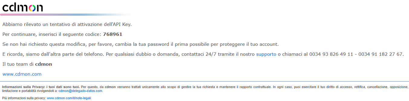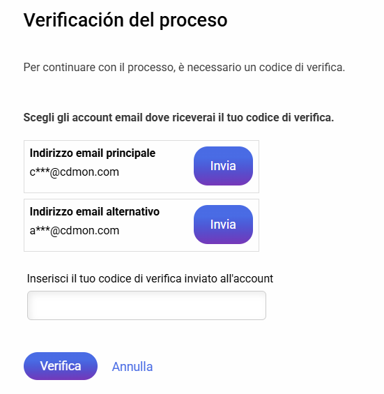 Il sistema invierà un codice di sicurezza alla mail di contatto CDmon.