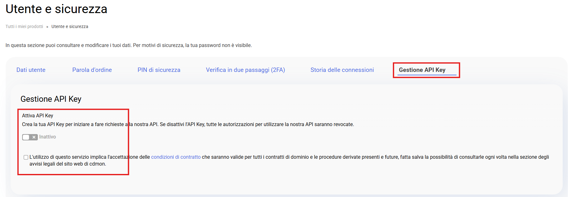 In questa guida mostriamo i passaggi da intraprendere per attivare l'API di dominio sull'utente cdmon dalla dashboard.