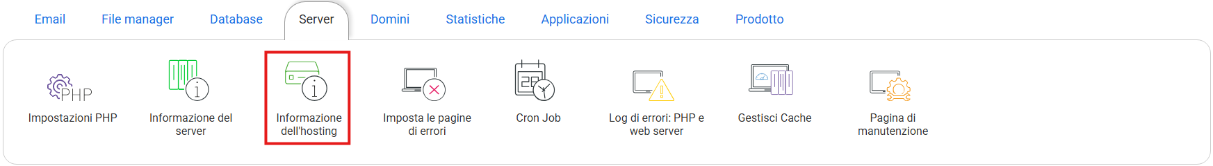 Per disabilitare 'mialias.net' è necessario accedere all'opzione Informazioni sull'alloggio, che puoi trovare nella sezione 'Server' nel gestione del vostro alloggio.