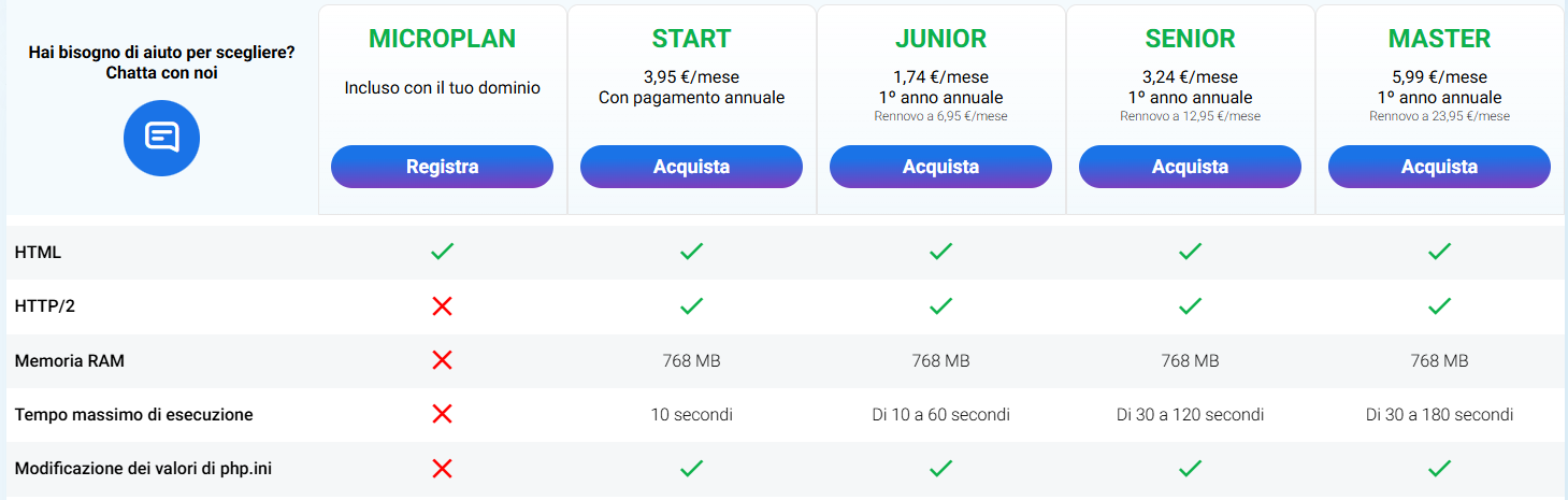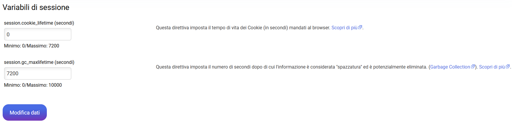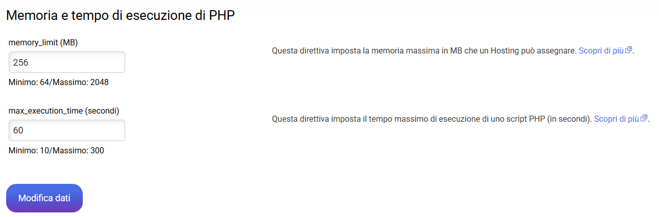 Nelle strumenti avanzati dell’hosting si trova l’opzione Configura PHP, dove puoi modificare diverse direttive PHP per adattare il tuo hosting ai requisiti richiesti da alcune applicazioni CMS. Questi valori variano in base al piano che hai ...
