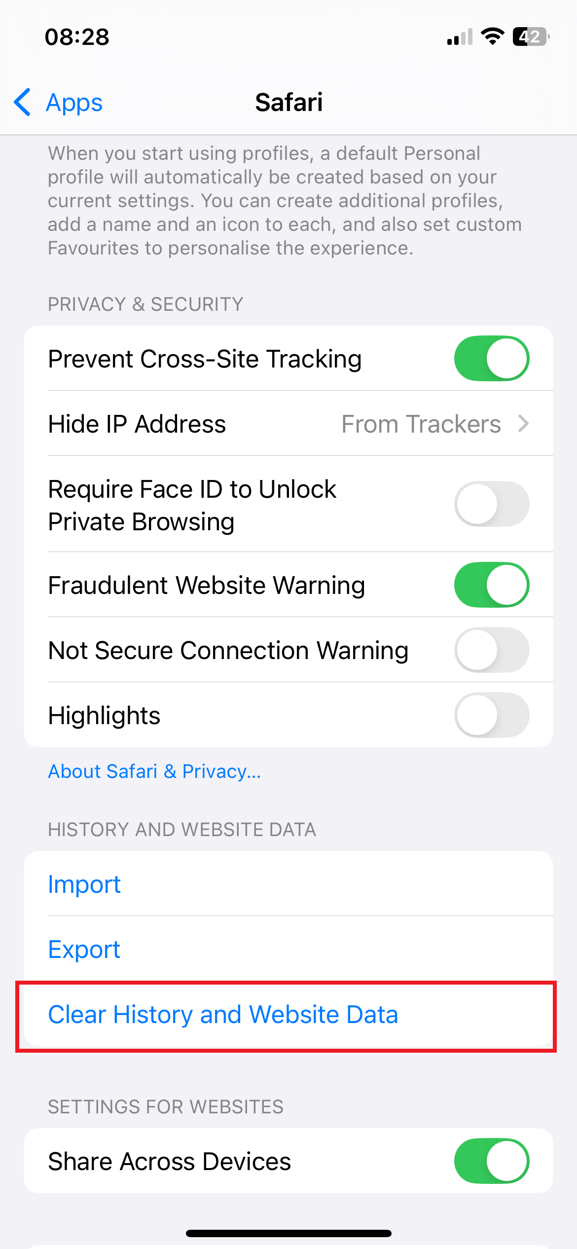 • Scorri verso il basso e premi su "Cancella cronologia e dati dei siti web".
