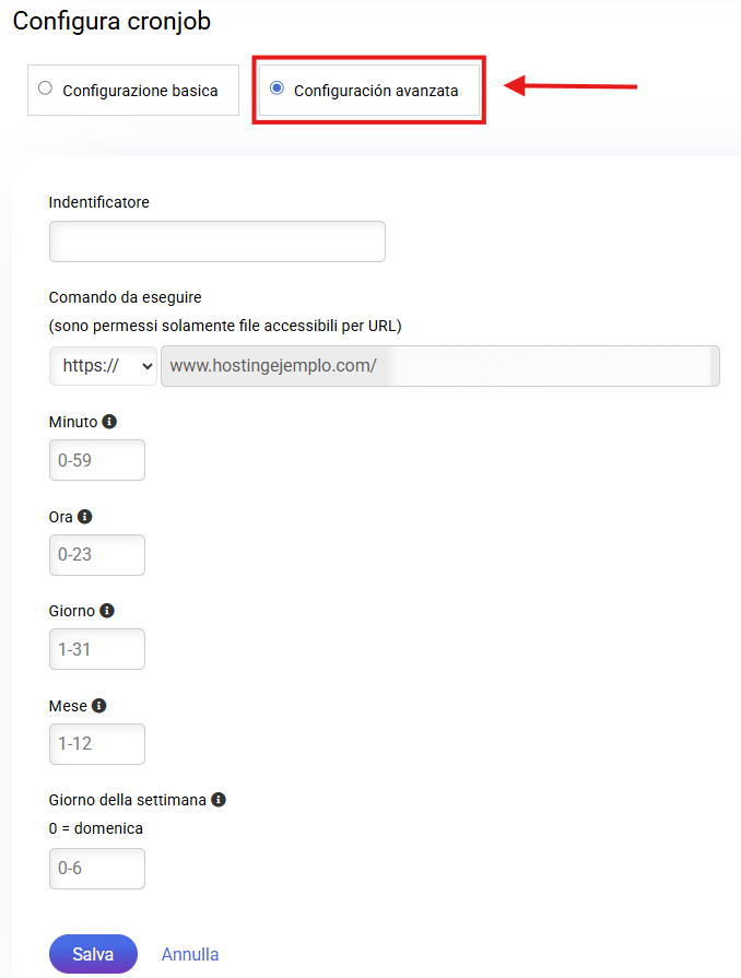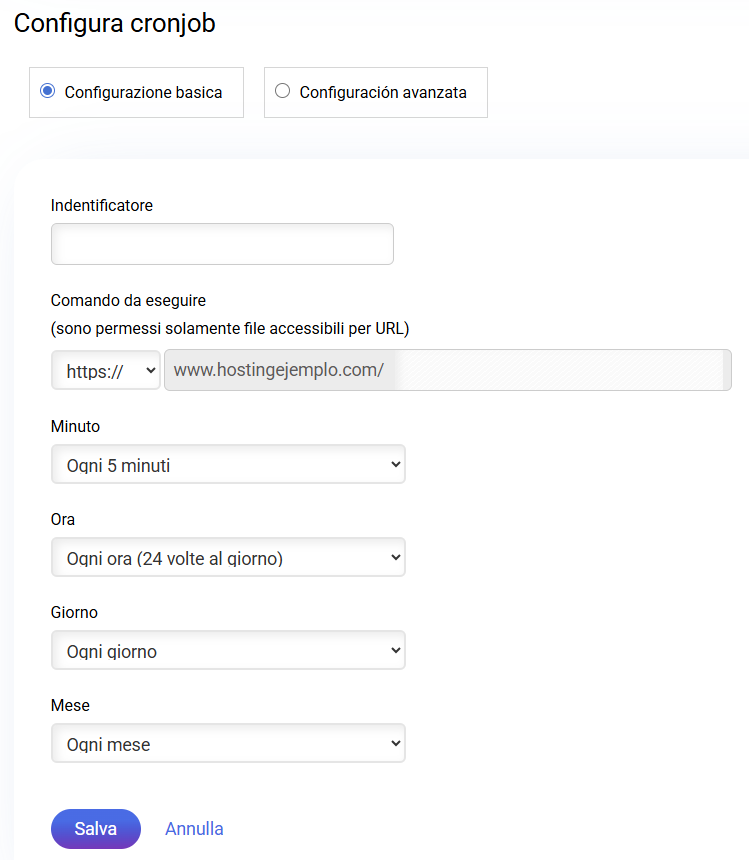 Comando da eseguire: chiamata allo script che desideri eseguire. Può essere un’esecuzione semplice oppure includere parametri nella chiamata (ad esempio, /cron.php?time_ex=oadpASDk). Può essere configurato per essere eseguito tramite http:// o https://