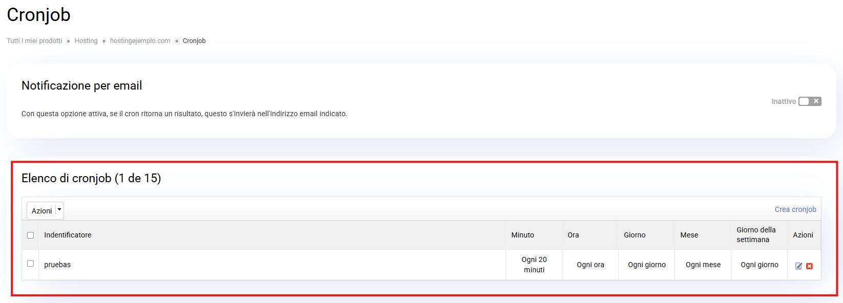 Nella parte inferiore del pannello vedrai la sezione "Elenco dei cronjob".