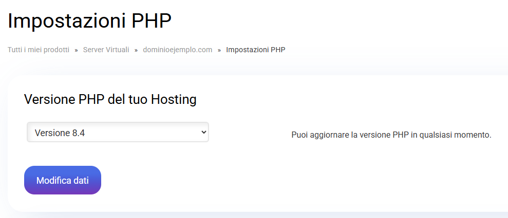 Da questa opzione è possibile modificare la versione di PHP più adatta a te.
