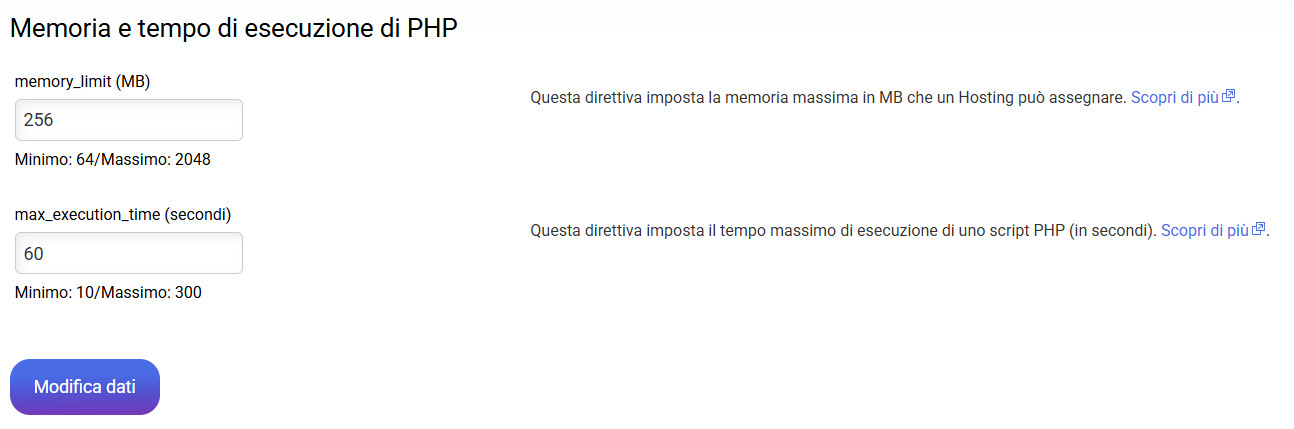 Due delle direttive PHP che puoi modificare sono Memory_limit e Max_execution_time. Queste due direttive sono una delle più importanti, in quanto la maggior parte delle applicazioni CMS o processi interni programmabili richiedono tempo e memoria per avere successo.