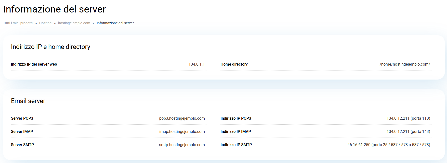 Accedendo a questa finestra, a sinistra troverai l’IP del server web e a destra gli IP di entrata e uscita della posta elettronica, evidenziati in questo esempio:
