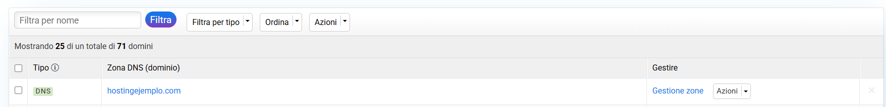 Nella schermata successiva verranno mostrate tutte le zone DNS degli hosting/domìni creati nel tuo utente cdmon; clicca su "Gestisci Zona" del dominio desiderato. Questo ti porterà all’elenco di tutti i record DNS creati nella zona DNS del nostro pannello di controllo.