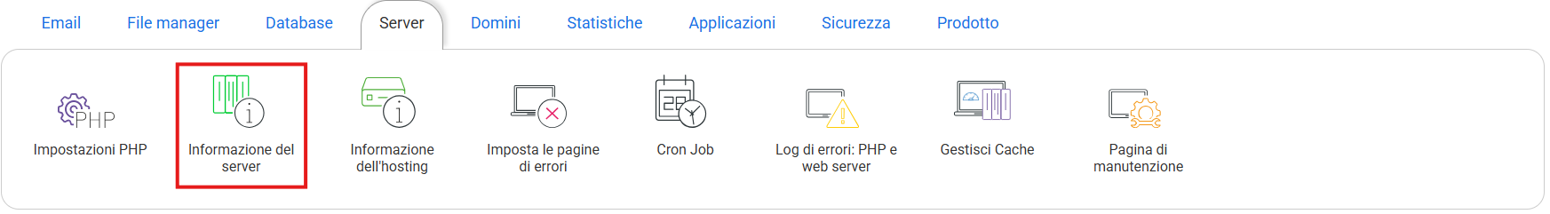 Accedi alla gestione dell’hosting dal pannello di controllo e cerca la sezione "Server" selezionando "Informazioni del Server":