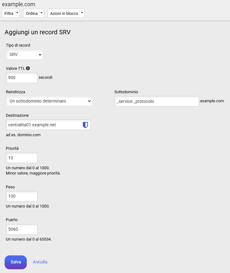 Indica il valore TTL, il sottodominio (protocollo), il dominio di destinazione, la priorità, il peso, la porta e salva il record.