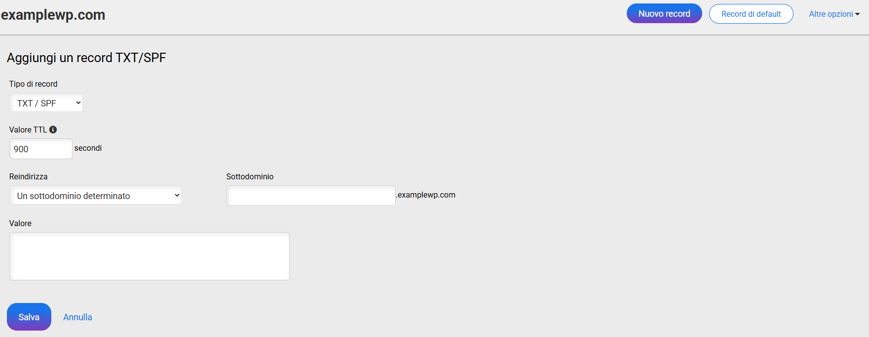Indica il sottodominio, il valore e salva il record.