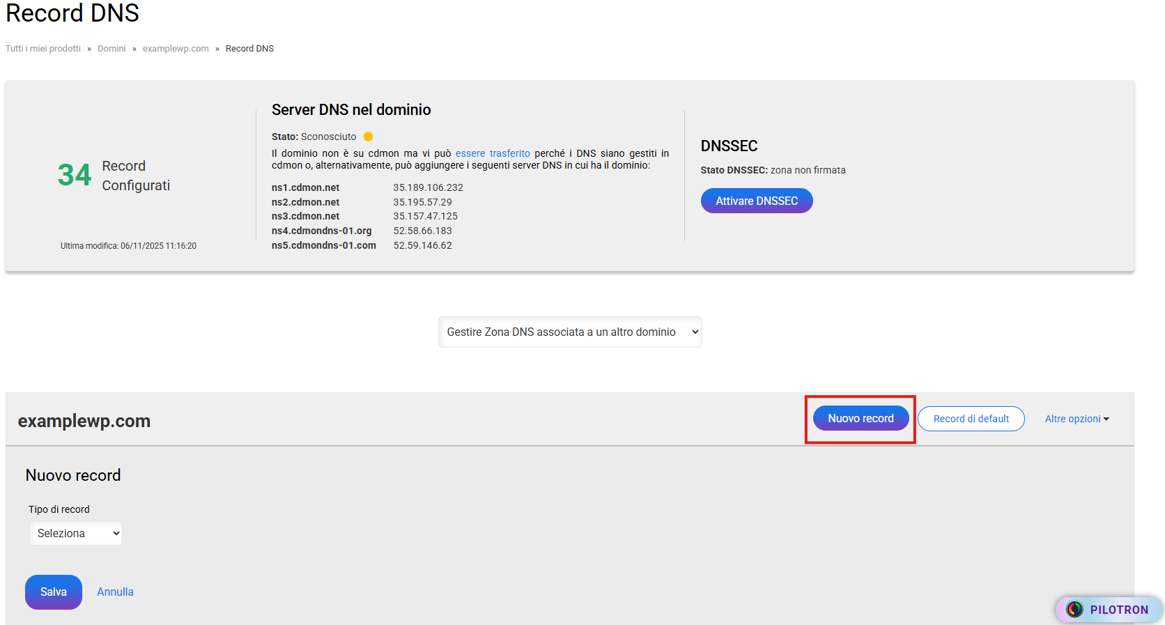 Nell’elenco "Record DNS" clicca su Nuovo record e in "Tipo di record" scegli l’opzione di tipo TXT/SPF.