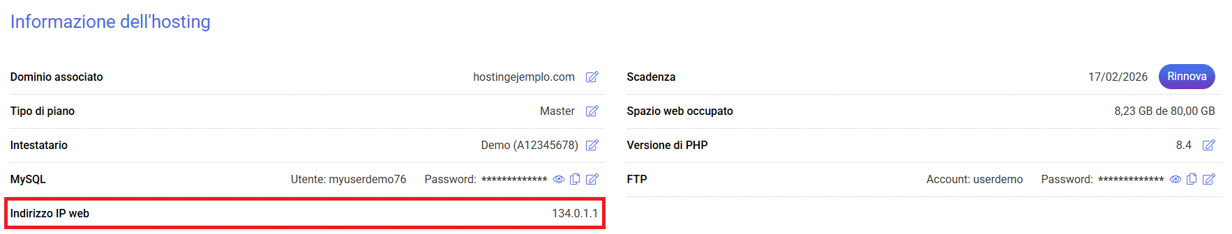 - In questa sezione vedrai l’IP pubblico assegnato al tuo hosting. È il valore che devi inserire in “Hostname”.